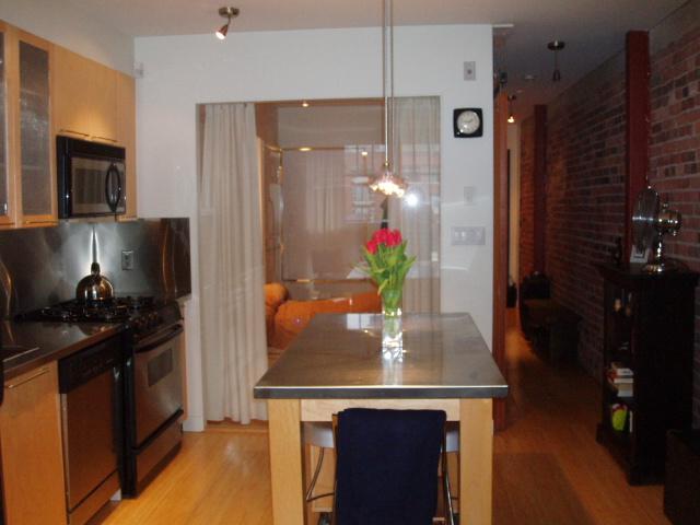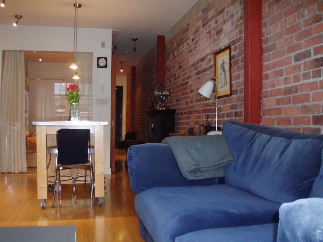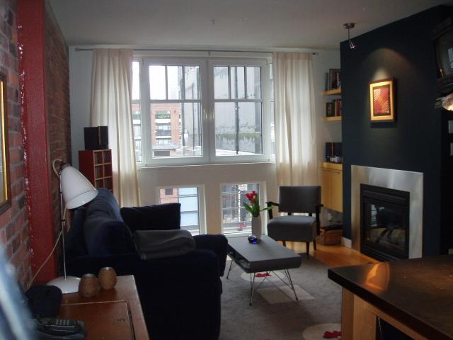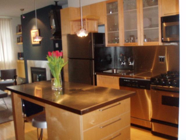 This one bedroom loft boasts historic exposed brick wall & beams, real bamboo H/W flrs throughout, custom built-in workstation, 9' ceilings, full stainless appliance package, stainless countertops & backsplash, 9' ceilings, moveable kitchen island w/ stainless countertop & built-in drawers for extra storage, black glazed ceramic tiles bathroom floors, real fir sliding door system, contemporary glass wall, tilt&turn large picture windows, gas f/p, insuite laundry & more. Plenty of storage and a convenient storage locker on the same floor! The loft provides gorgeous afternoon sun with west and north exposure with a cool breeze. Great Privacy as you look across towards a 2 storey building only.
